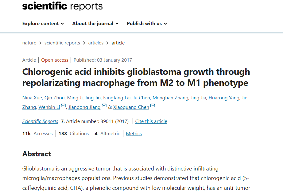 2017年1月上旬,中國(guó)醫(yī)科院藥物研究所聯(lián)合四川九章生物科技有限公司及北京世紀(jì)壇醫(yī)院腦膠質(zhì)瘤科在《Scientific Reports》 上發(fā)布了名為《Chlorogenic acid inhibits glioblastomagrowth through repolarizating macrophage from M2 to M1 phenotype》(綠原酸通過(guò)復(fù)極化使M2型巨噬細(xì)胞轉(zhuǎn)化為M1型巨噬細(xì)胞抑制惡性膠質(zhì)瘤細(xì)胞的生長(zhǎng))的文章,詳細(xì)闡述并論證了注射用綠原酸(四川九章生物科技有限公司研發(fā))促進(jìn)惡性腫瘤細(xì)胞凋亡和抑制腫瘤生長(zhǎng)的機(jī)制,即通過(guò)復(fù)極化上調(diào)腫瘤相關(guān)巨噬細(xì)胞M1表型,抑制腫瘤相關(guān)巨噬細(xì)胞M2表型,同時(shí)促進(jìn)M2型巨噬細(xì)胞向M1型巨噬細(xì)胞的轉(zhuǎn)化。