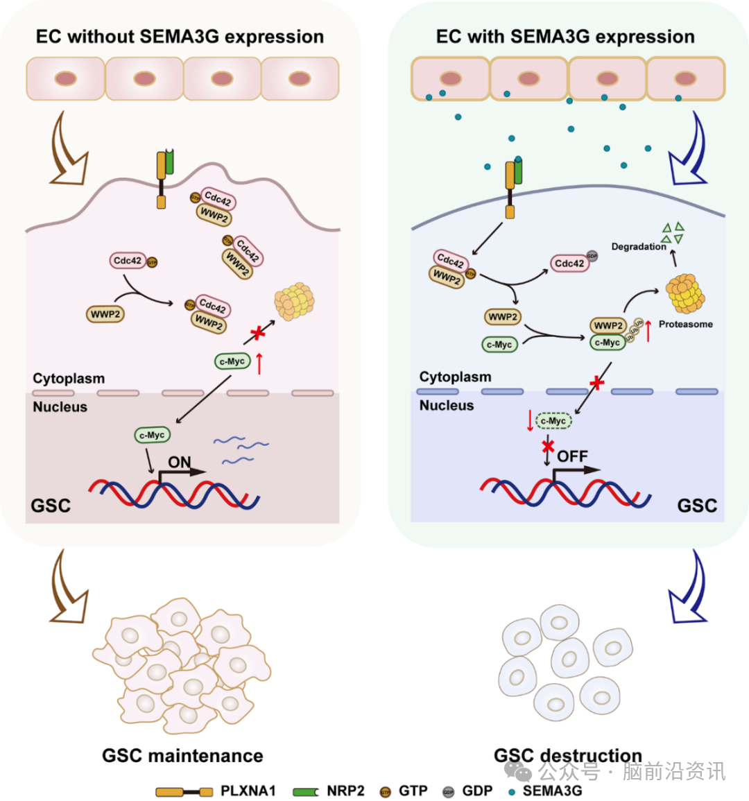 進一步的機制研究與靶標(biāo)確證研究,發(fā)現(xiàn)SEMA3G通過作用于GSCs的NRP2/PLXNA1受體復(fù)合物特異性抑制Cdc42-GTP活性(而非RhoA/Rac1),而Cdc42活性狀態(tài)則動態(tài)調(diào)控與E3泛素連接酶WWP2的結(jié)合偏好:活性Cdc42優(yōu)先結(jié)合WWP2并保護c-Myc免于降解,而SEMA3G通過抑制Cdc42活性促使WWP2轉(zhuǎn)位至c-Myc,介導(dǎo)c-Myc泛素化降解,從而破壞GSCs干性,抑制膠質(zhì)母細胞瘤的生長。