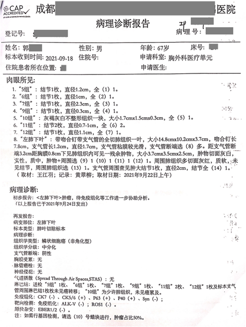 病理診斷報告為左肺下葉中分化鱗狀細胞癌