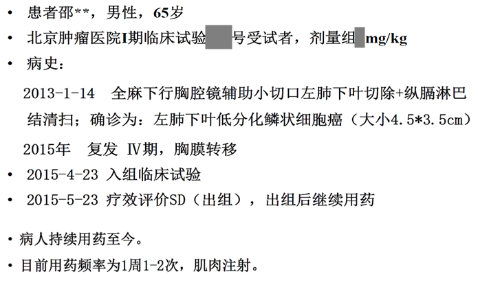 實體瘤I期臨床研究(北京腫瘤醫(yī)院),有一位低分化肺鱗癌晚期淋巴轉(zhuǎn)移伴胸膜轉(zhuǎn)移患者于2015年參與臨床試驗,在完成試驗用藥后出組,出組后該患者繼續(xù)單獨使用注射用綠原酸,持續(xù)至今,2024年2月,該患者復(fù)查報告顯示肺部病灶已完全緩解,目前狀態(tài)良好,已延長生存期10年。