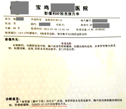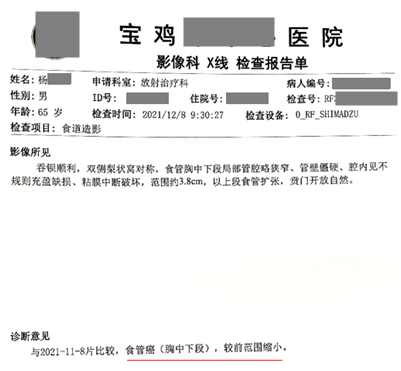 用藥前患者病理檢查確診為食管癌(鱗狀細胞癌),沒有手術(shù)指征,無法進行手術(shù)。隨后開始聯(lián)合放化療使用注射用綠原酸,完成9次化療后,開始單獨使用注射用綠原酸至今。用藥20天影像學(xué)檢查顯示病灶范圍較前縮?。挥盟?年7個月復(fù)查,顯示食管管腔較前變化不大;聯(lián)合用藥期間,放化療基本沒有副作用?;颊哂盟幹两?,不影響外出旅游,病情穩(wěn)定向好,無復(fù)發(fā)和轉(zhuǎn)移跡象,血生化指標(biāo)正常,生活狀態(tài)良好。