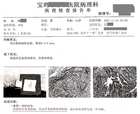 病理檢查報告確診為食管癌(鱗狀細胞癌)